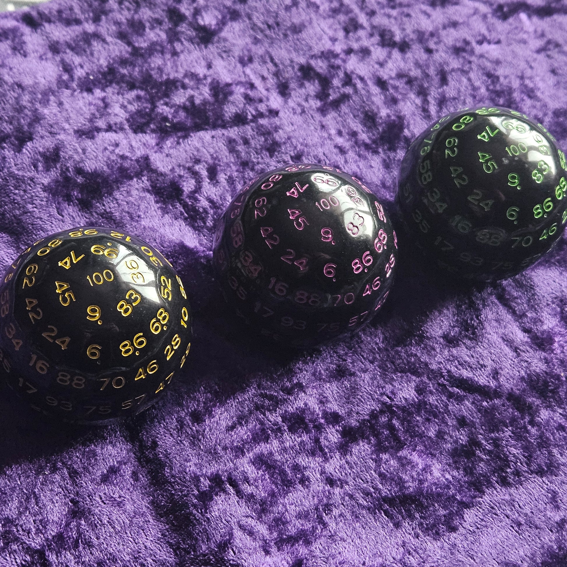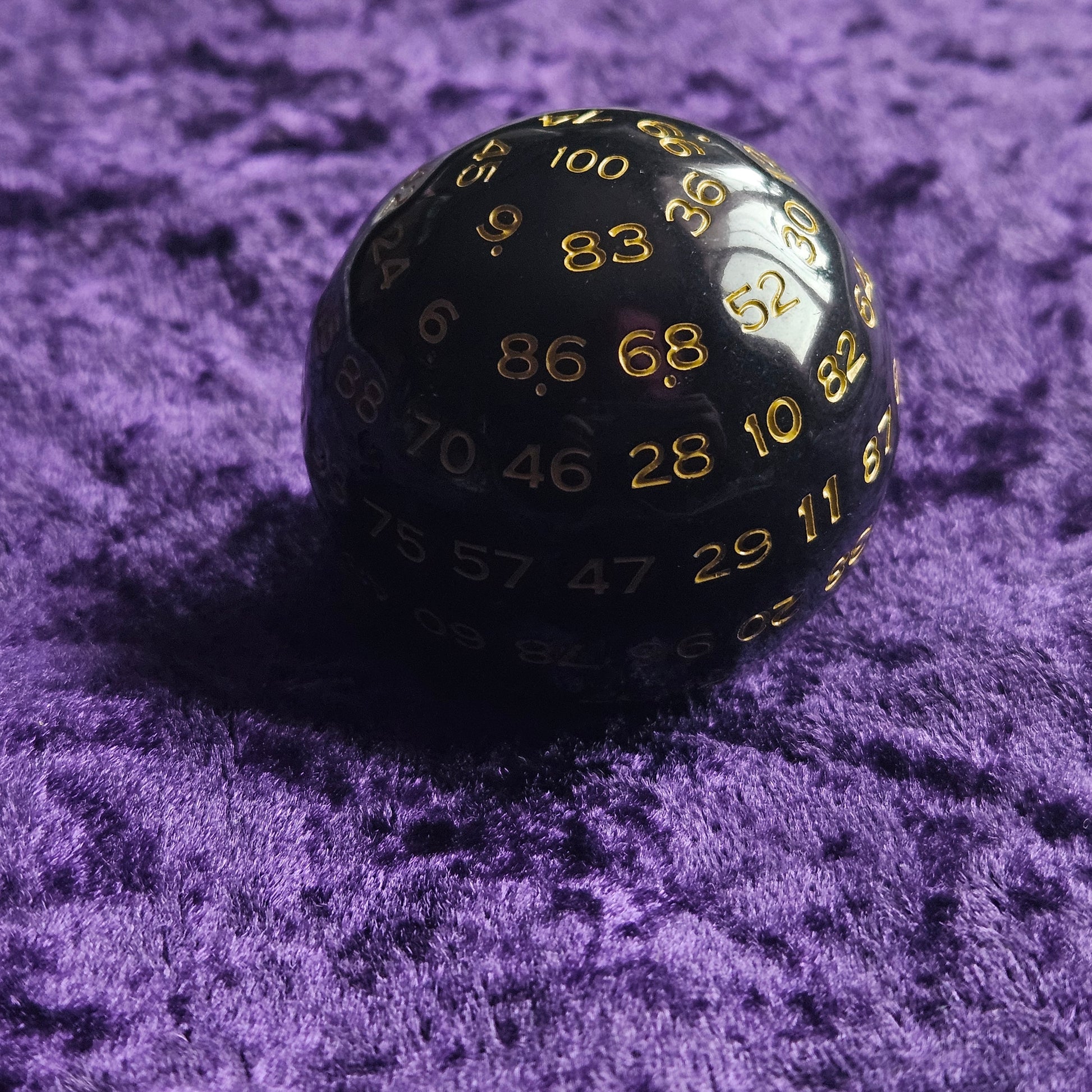 A single large black d100. A fun alternative to percentile dice. All of our d100 are black but you have different font colour options.