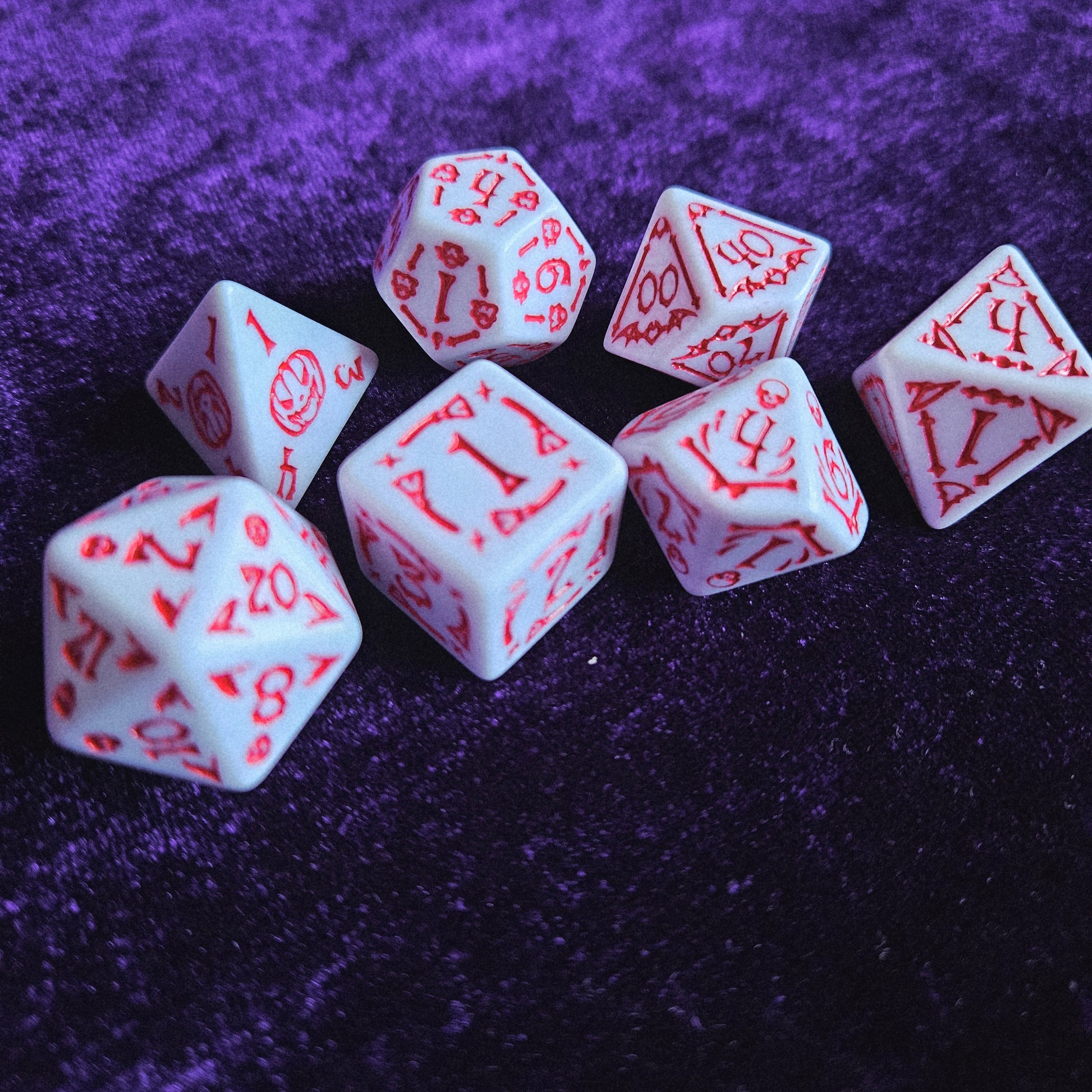 These dice have a opaque finish and vibrant Halloween graphics like broomsticks, pumpkins and bats