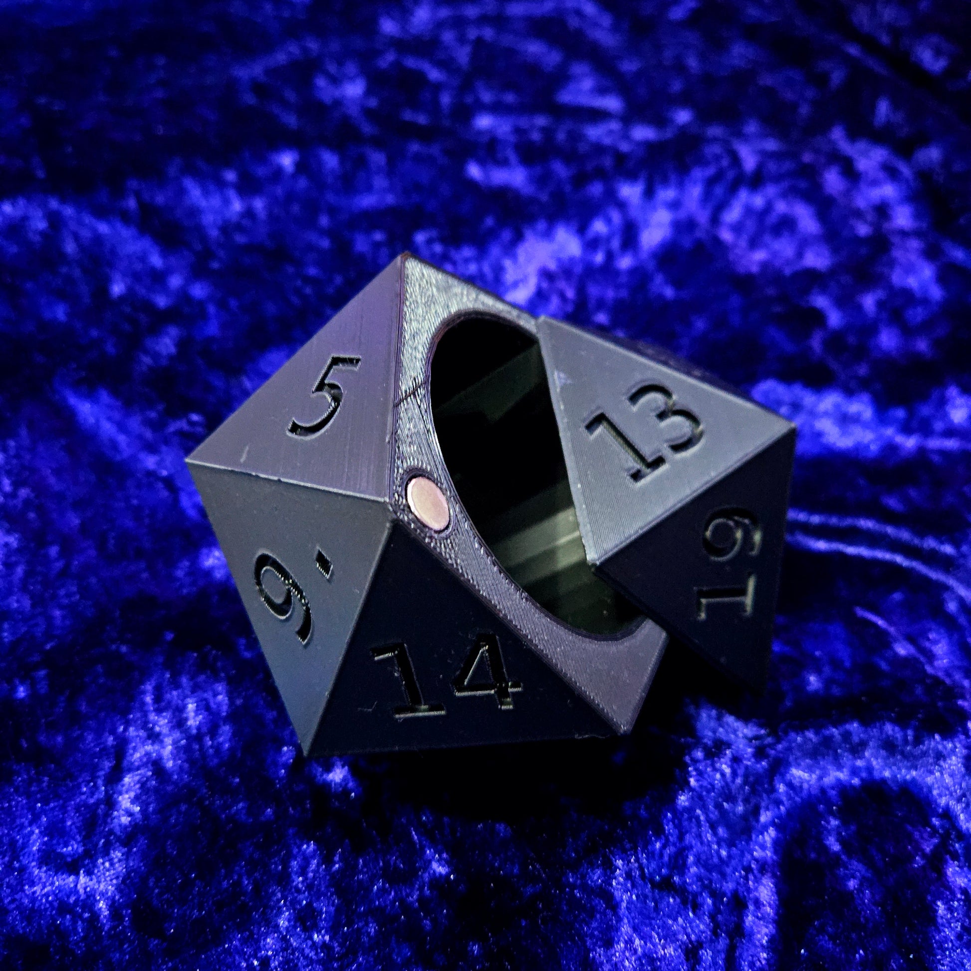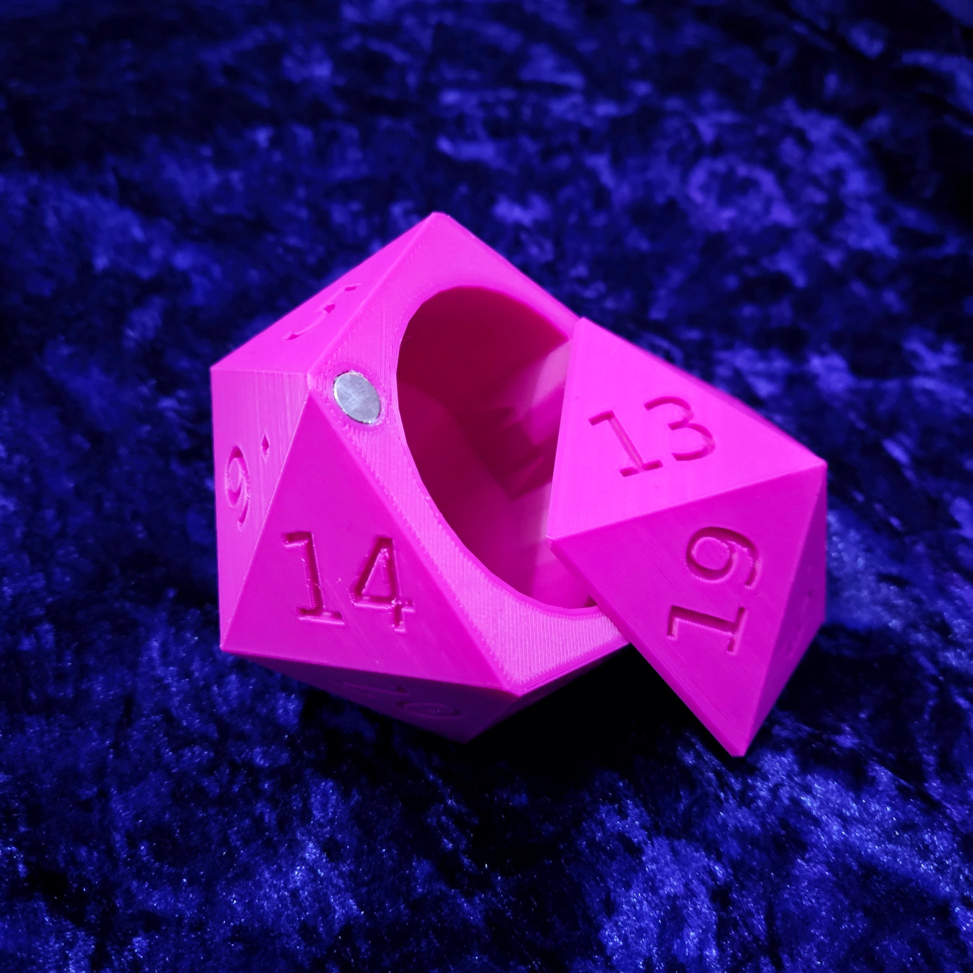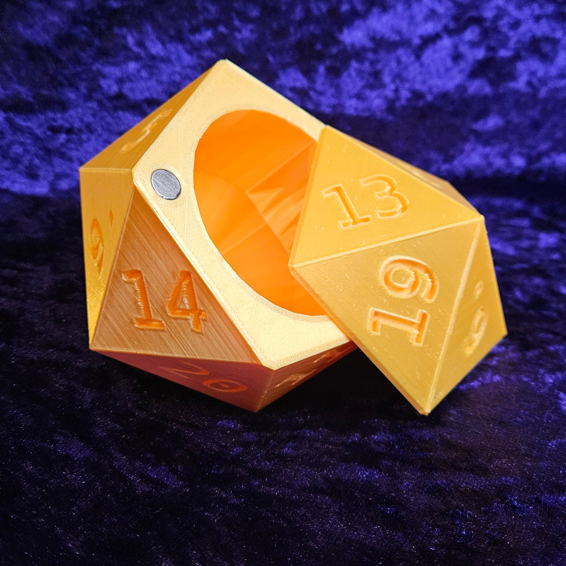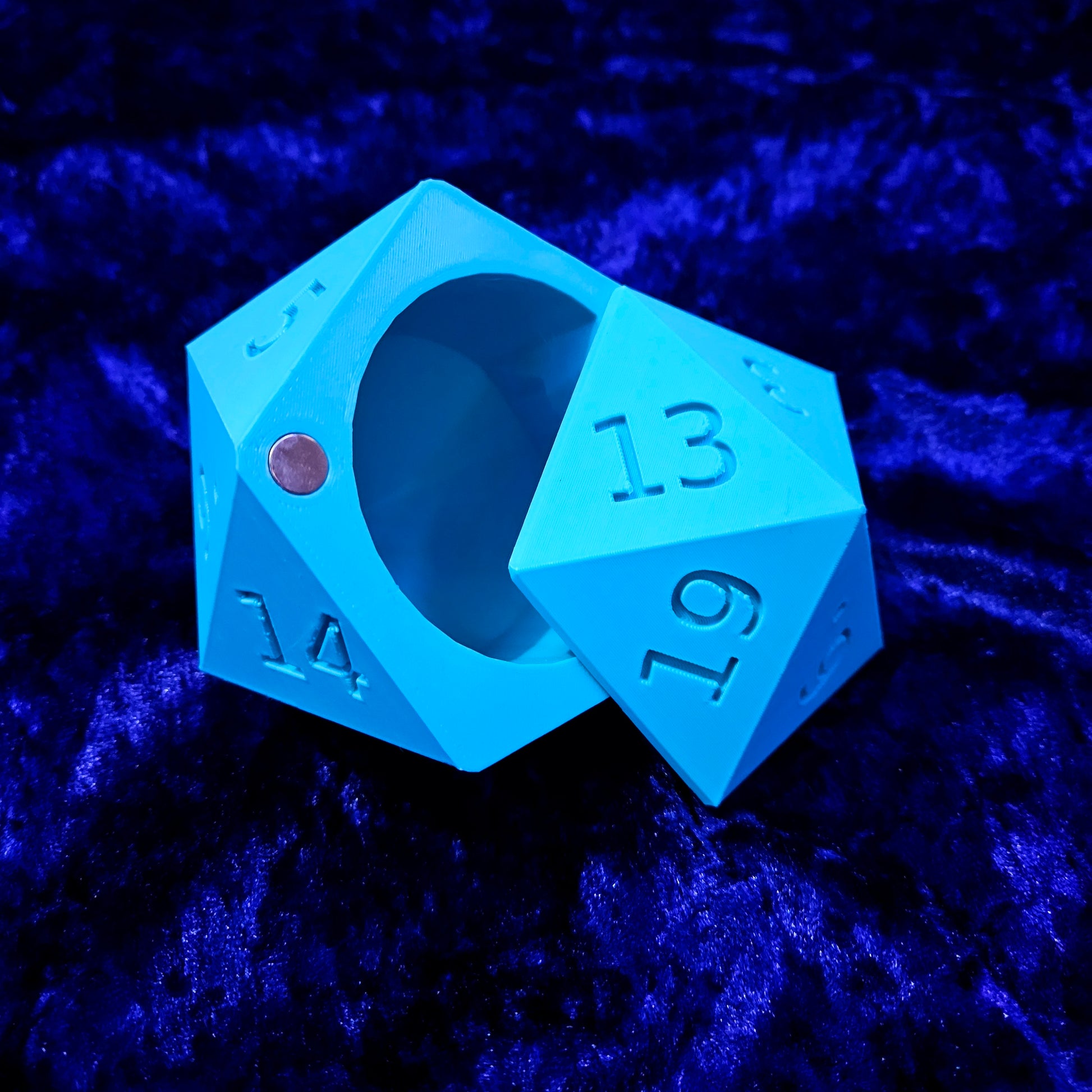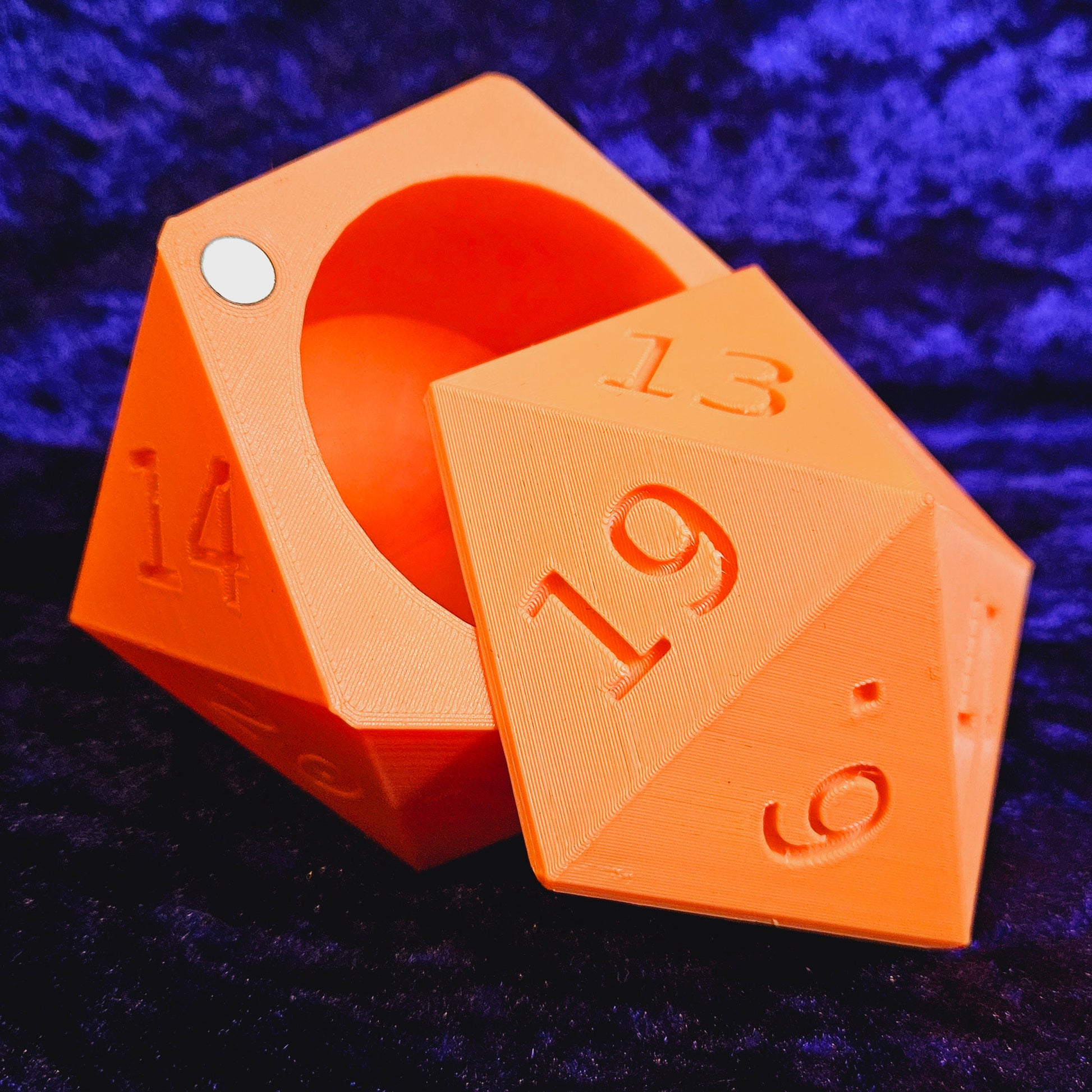 This 3d printed d20 easily holds 2 sets of dice and snaps closed with a magnet. D20 pictured for scale and is not included. These are printed to order and can take up to a week to dispatch.