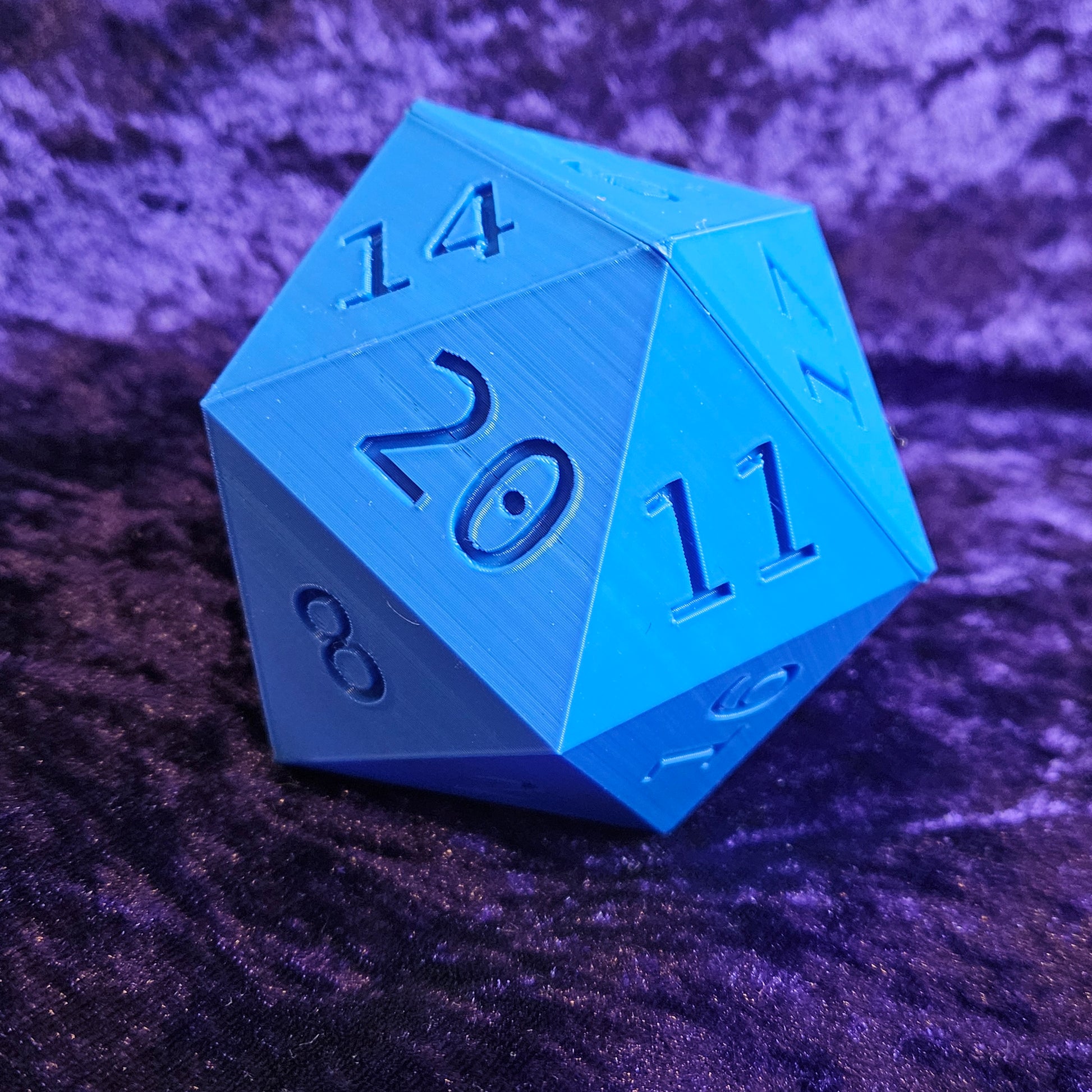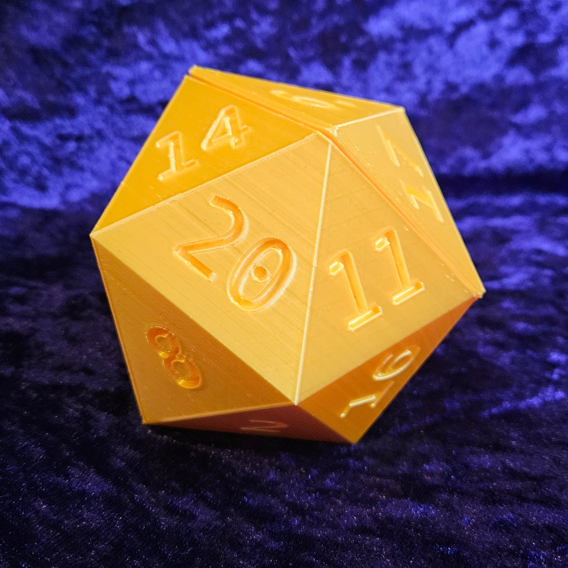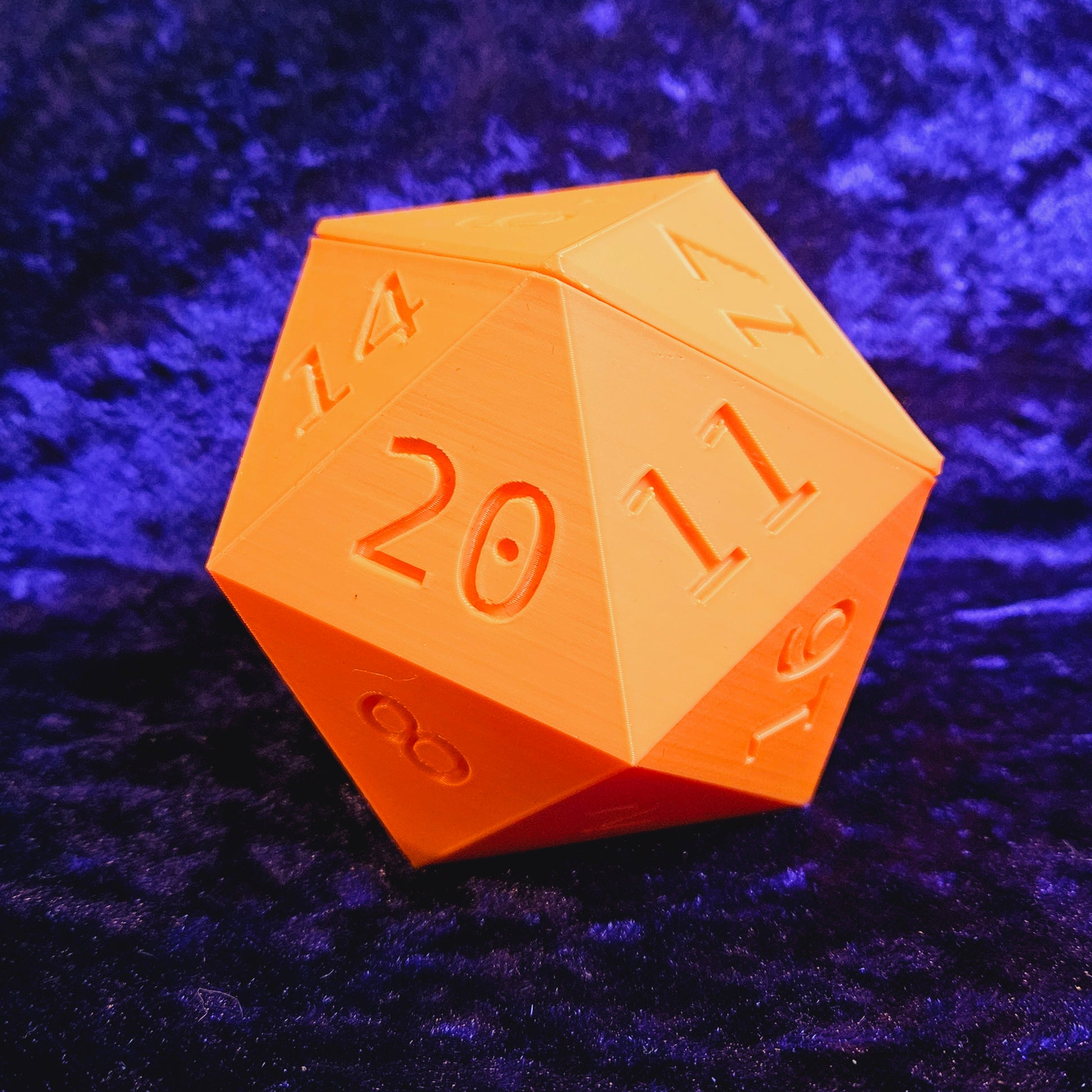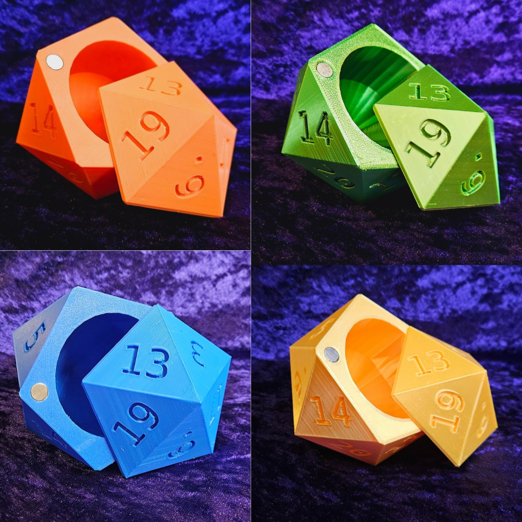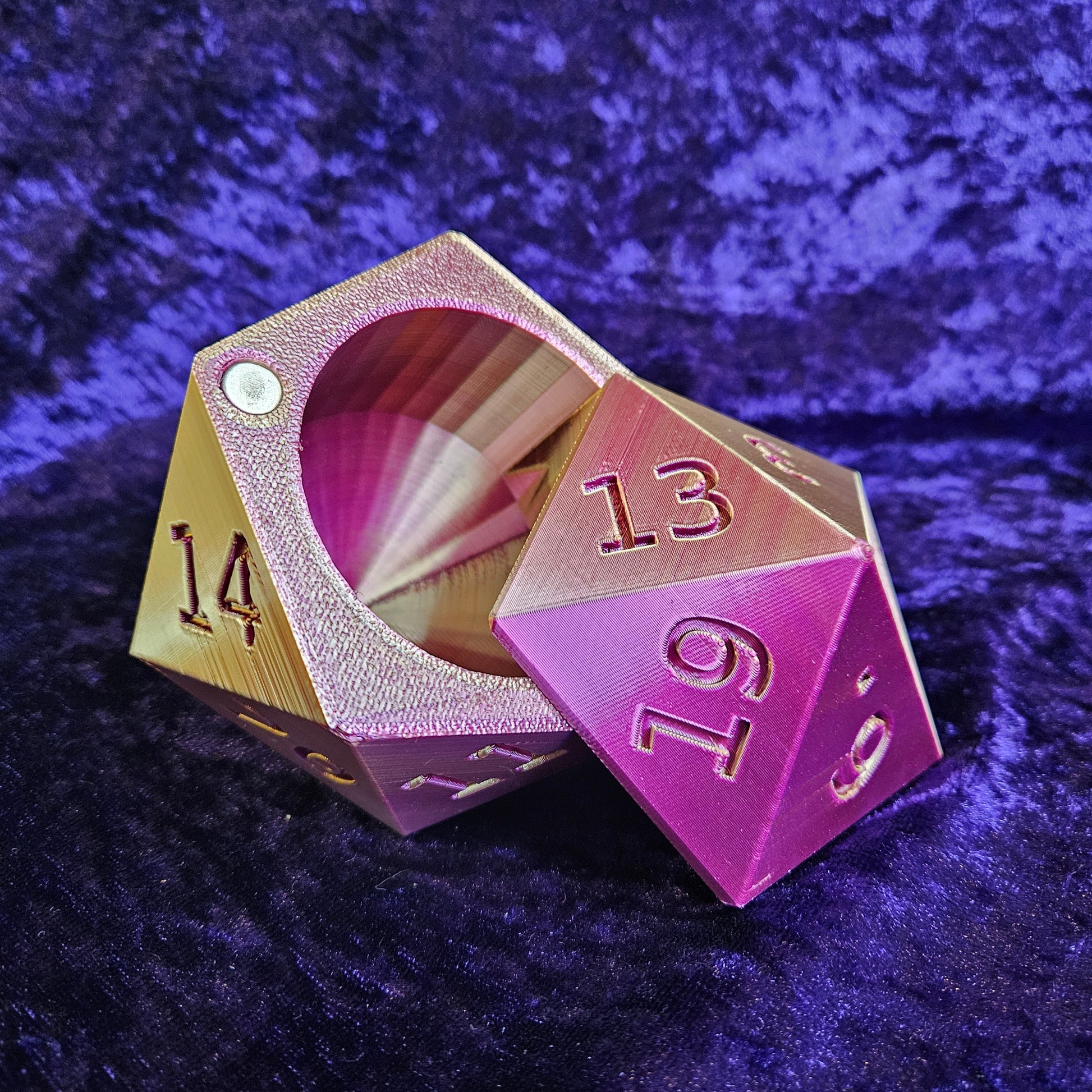 This 3d printed d20 easily holds 2 sets of dice and snaps closed with a magnet. D20 pictured for scale and is not included. These are printed to order and can take up to a week to dispatch.