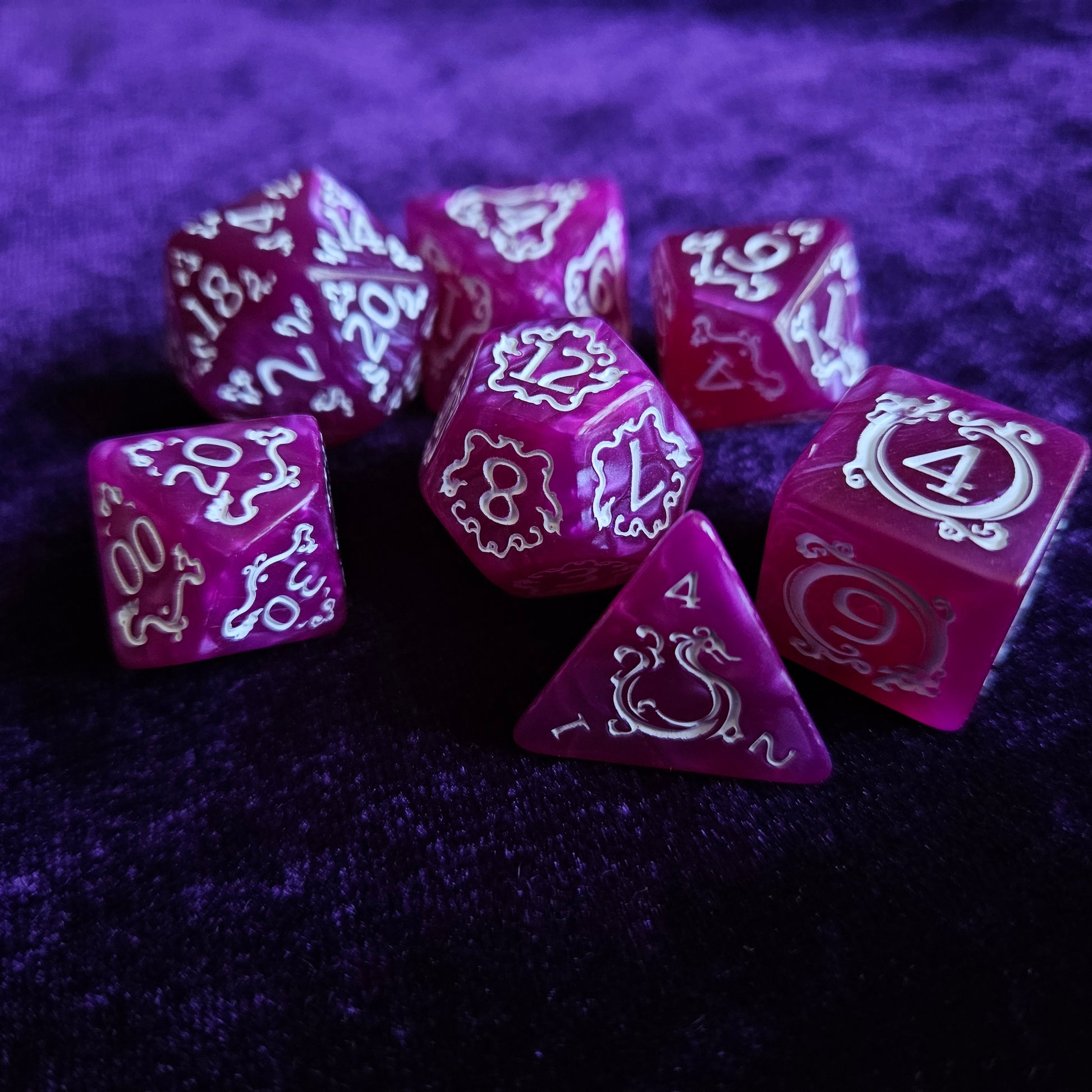 A full set of polyhedral dice with beautiful white detailing