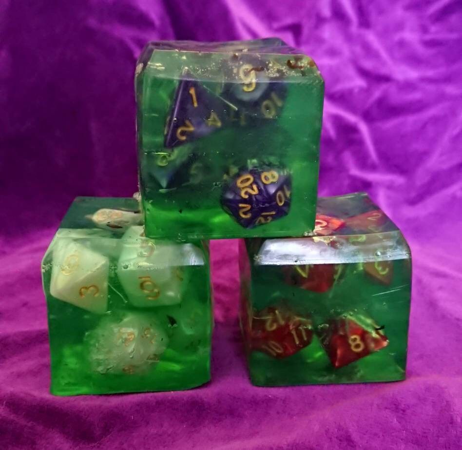 The friendliest gelly cubes around! With a 90% guarantee they won't envelop you, these soaps have a refreshing scent and contain a full set of polyhedral dice.