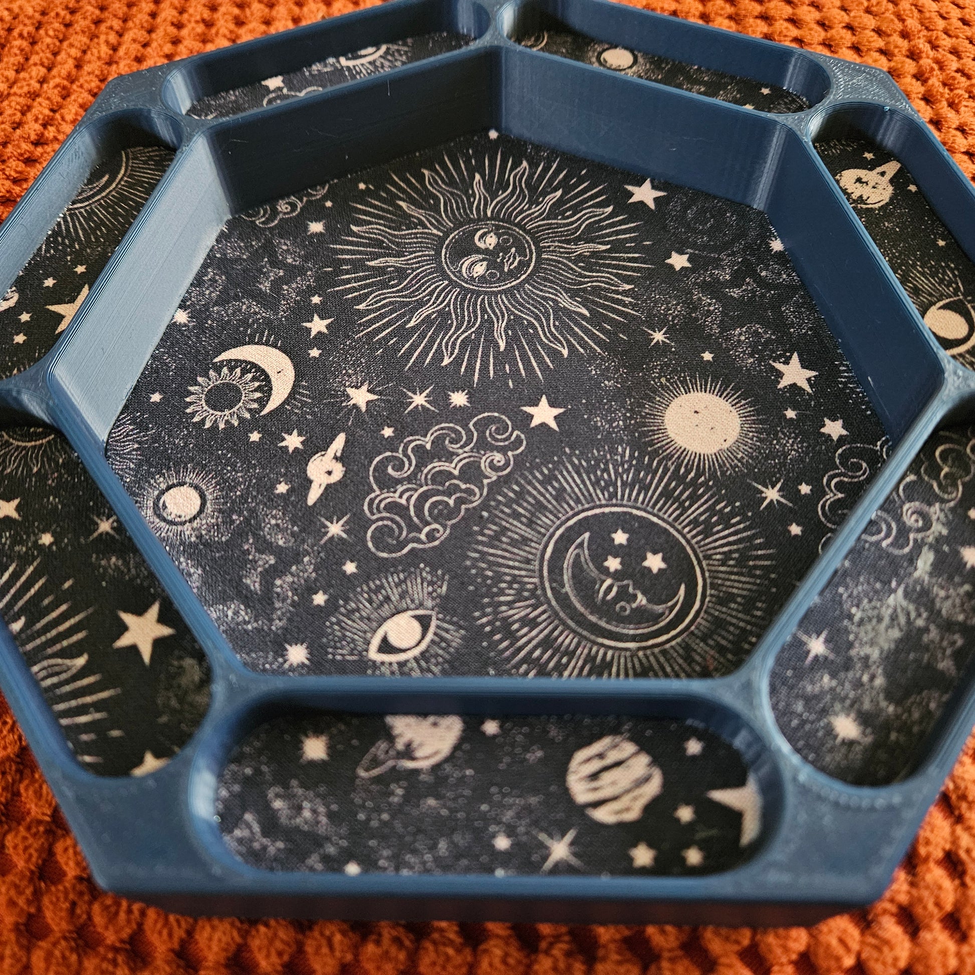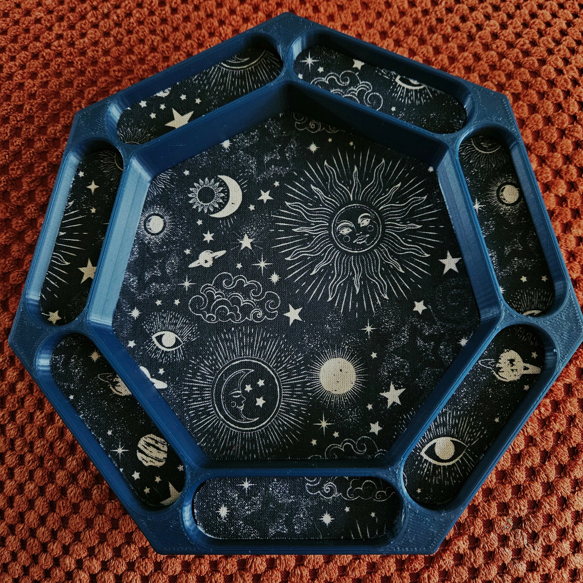 This 3D printed dice tray has spacious centre, felt base and holding sections around the edge. It can contain all the dice you'd ever need for an epic gaming session.