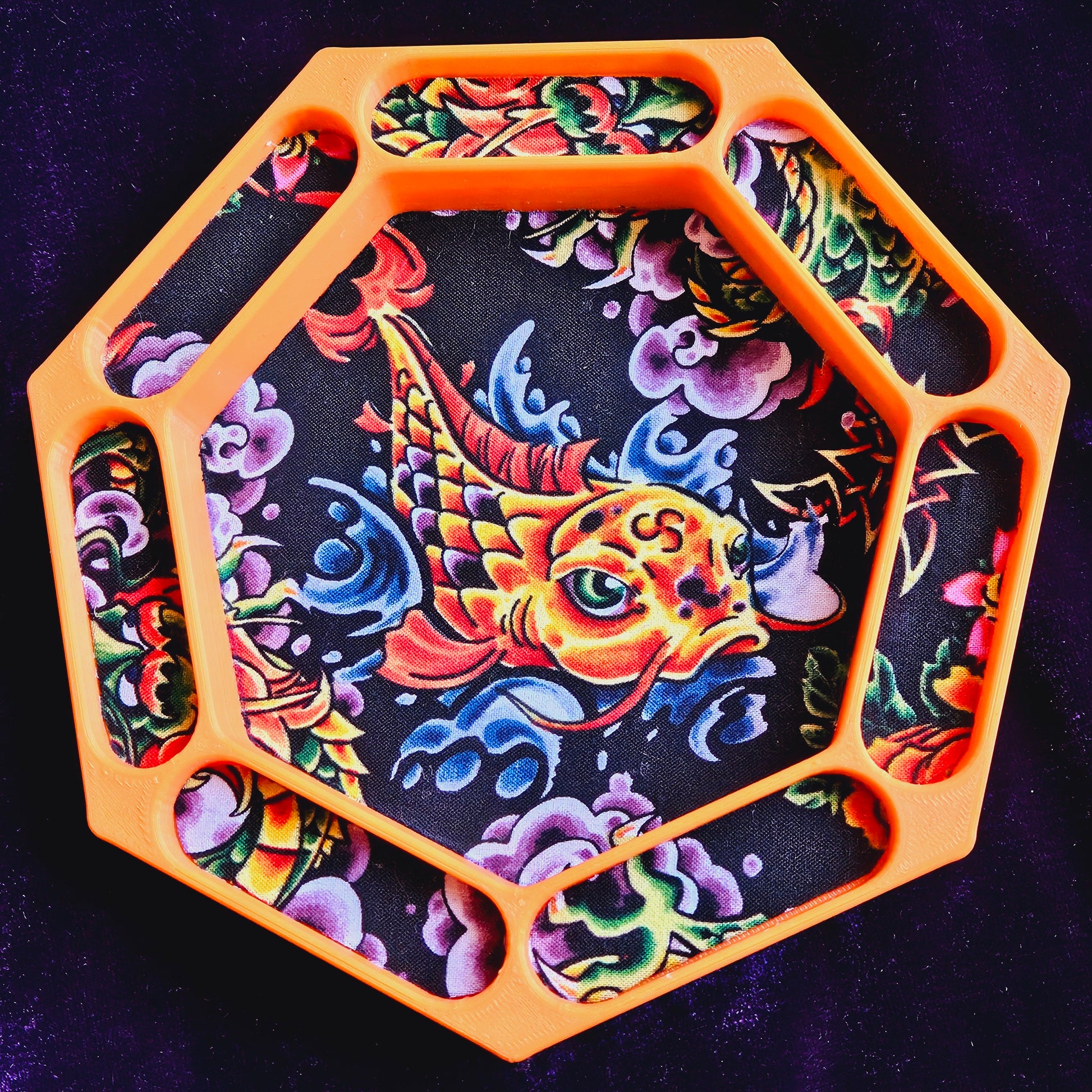 This 3D printed dice tray has spacious centre, felt base and holding sections around the edge. It can contain all the dice you'd ever need for an epic gaming session.