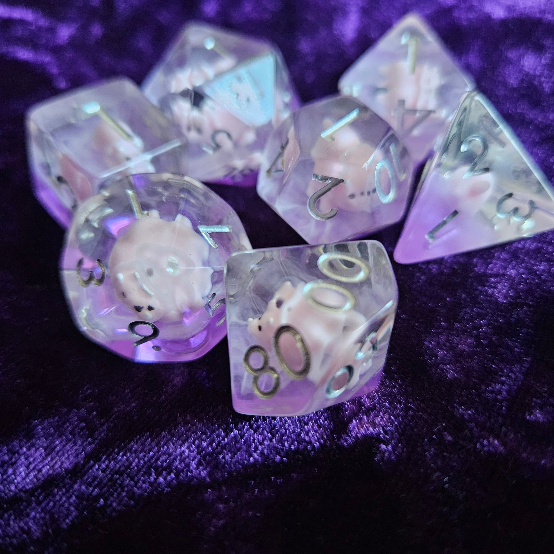 A 7 piece set of polyhedral dice with tiny pink triceratops inclusions